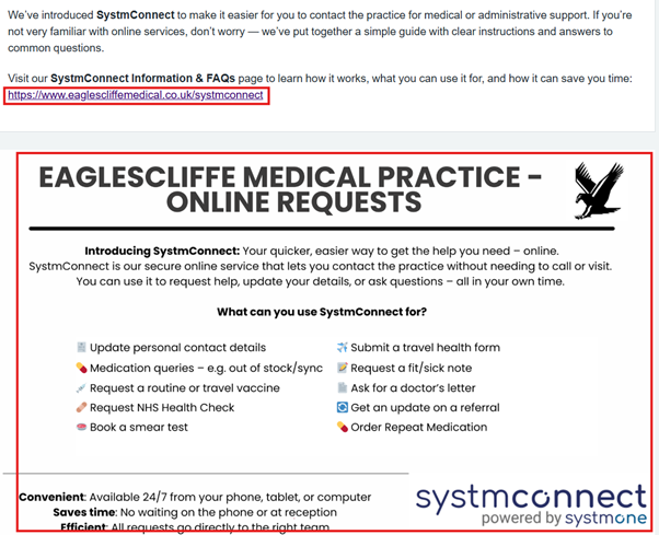 Non-urgent advice: SystmConnect – Your New Way to Connect with Eaglescliffe Medical Practice